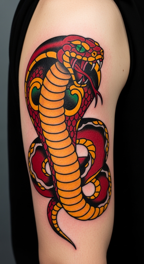 The cobra tattoo traditional style is a classic, and for good reason. Bold lines. Limited colors. Zero confusion.