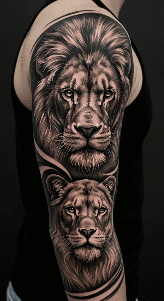 Talk about power couple vibes! Couple tattoos lion and lioness scream strength, loyalty, and protection.