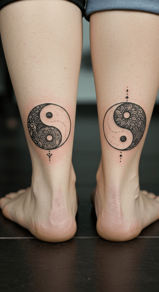 Classic balance. Yin and yang tattoos symbolize opposites completing each other.