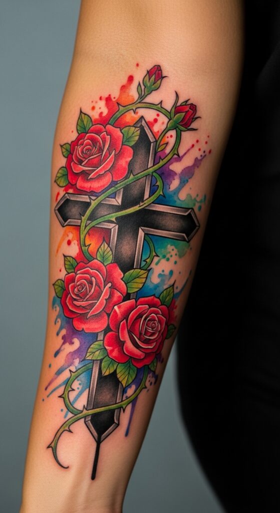Imagine a cross entwined with blooming roses—symbolizing sacrifice mixed with love and beauty. This combo elevates cross tattoos for women to something poetic, but hey, it’s unisex and looks epic on anyone. The thorns add edge, reminding us life’s not all petals.