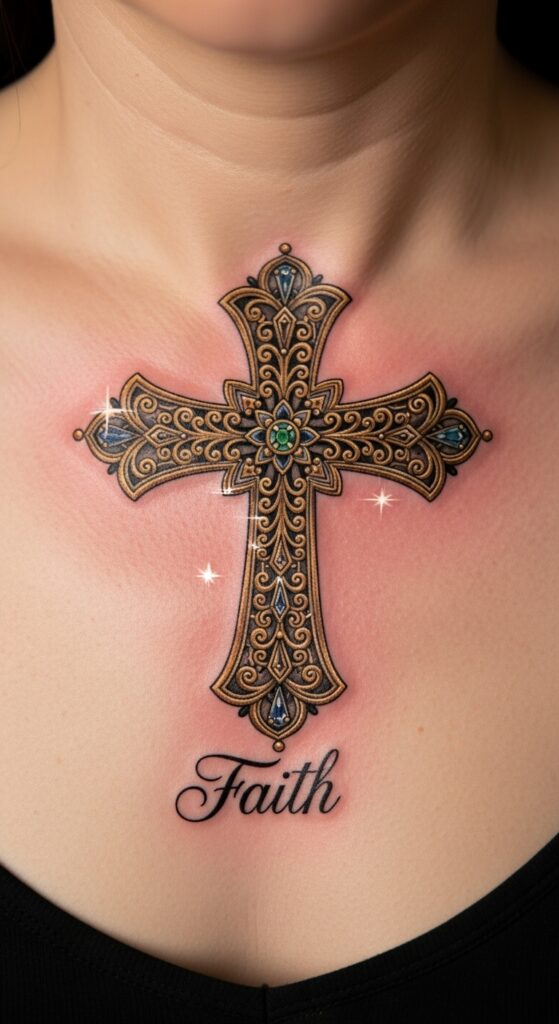 Top off a cross with meaningful script—like a Bible verse or loved one’s name—and you’ve got sentiment etched in. These ornate cross tattoos feature filigree or jewels, turning simple into stunning. Ideal for honoring roots or milestones.
