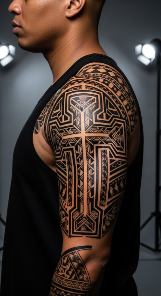 Make it yours: Incorporate Polynesian swirls or Maori motifs for authenticity. Men dig this on the shoulder for that broad canvas, while women might slim it for the collarbone. The cross tattoo meaning here leans toward resilience—think warrior spirit.