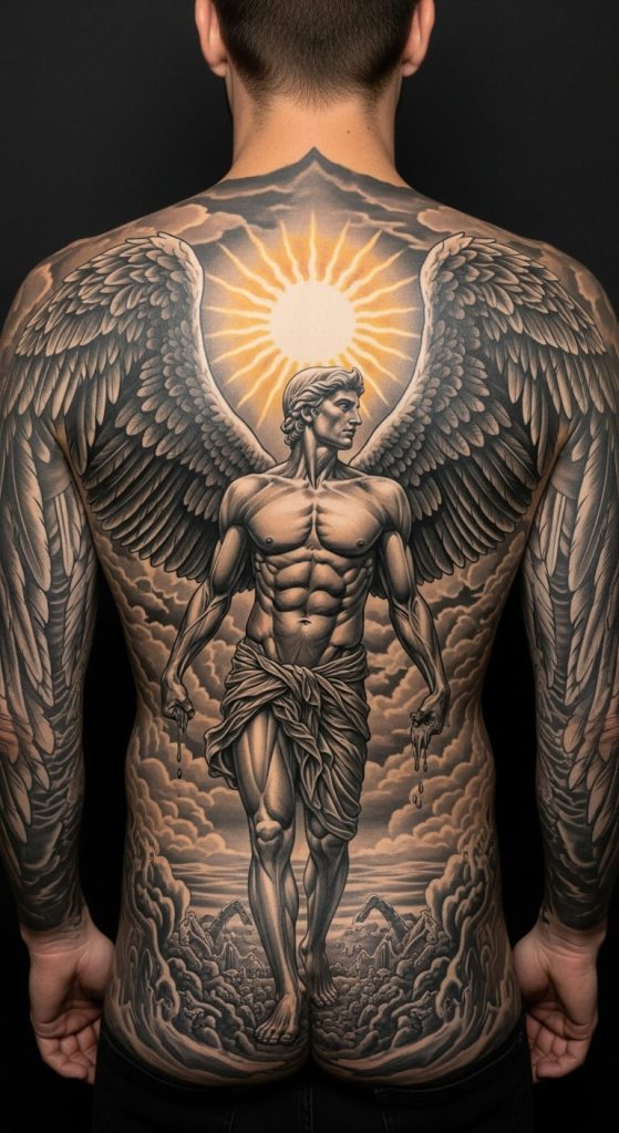 5. Icarus Back Tattoo (Huge Visual Impact)
