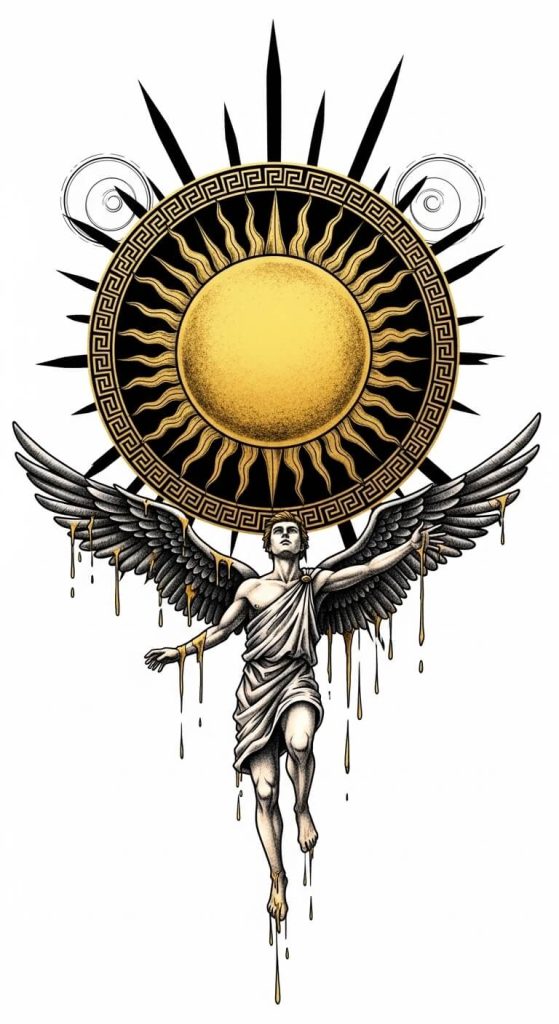 This design focuses on the relationship between Icarus and the blazing sun, a powerful symbol of ambition and danger.