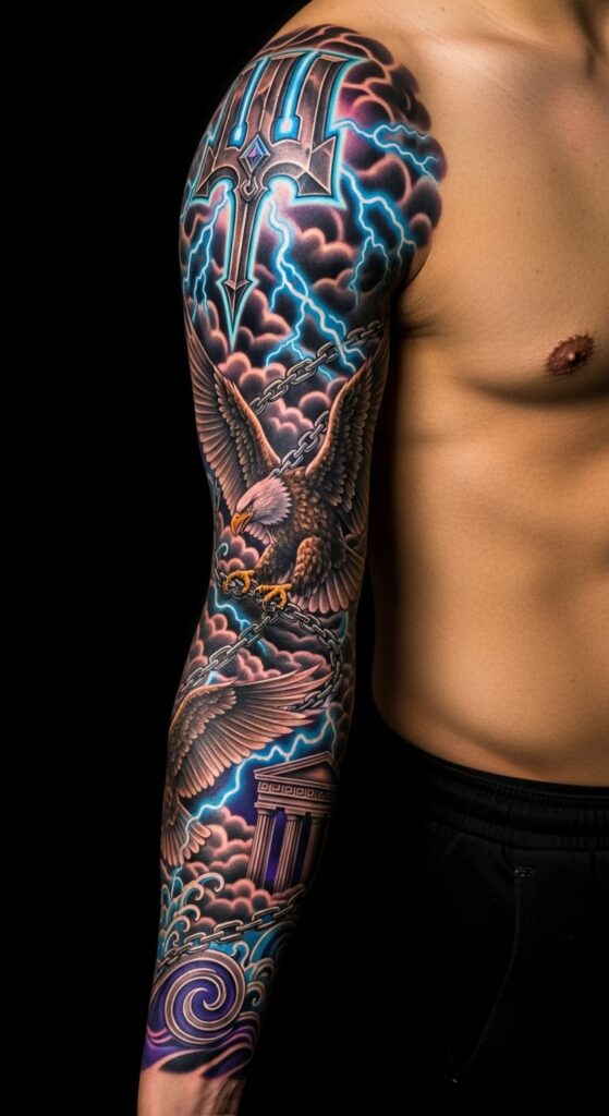 Thunderbolt tattoos often nod to mythology (like Zeus), emphasizing divine power, while lightning focuses on natural energy. Both rock in sleeve tattoo ideas, but thunderbolts add a mythical edge.