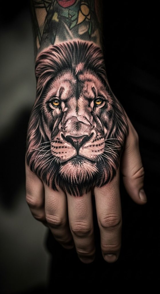 A lion tattoo on hand is one of the most striking placements—it’s visible all the time, and the shape of the hand fits perfectly with a lion’s face.