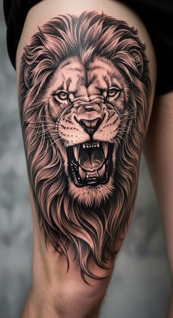 A lion tattoo on thigh is great if you want a big design but prefer something private.