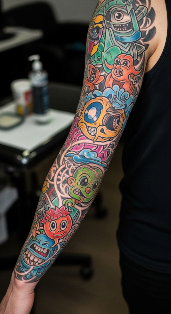 A new school tattoo sleeve is like wearing a comic book on your arm. Every section tells a story, and the colors flow together like a masterpiece.