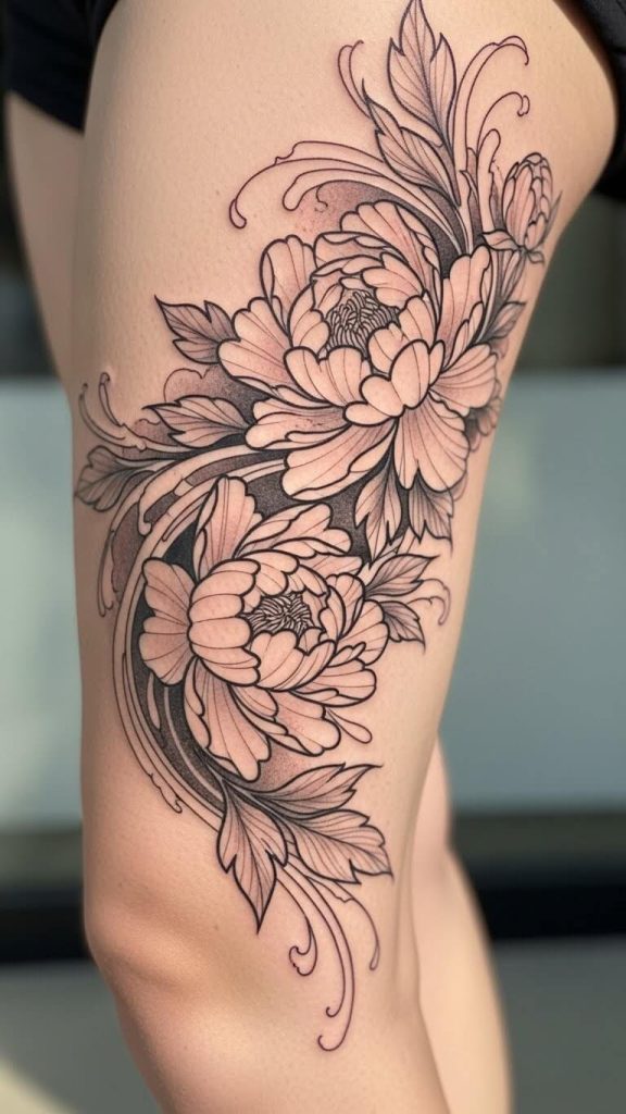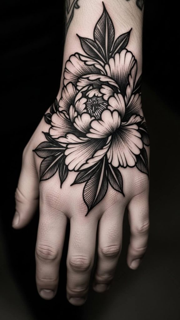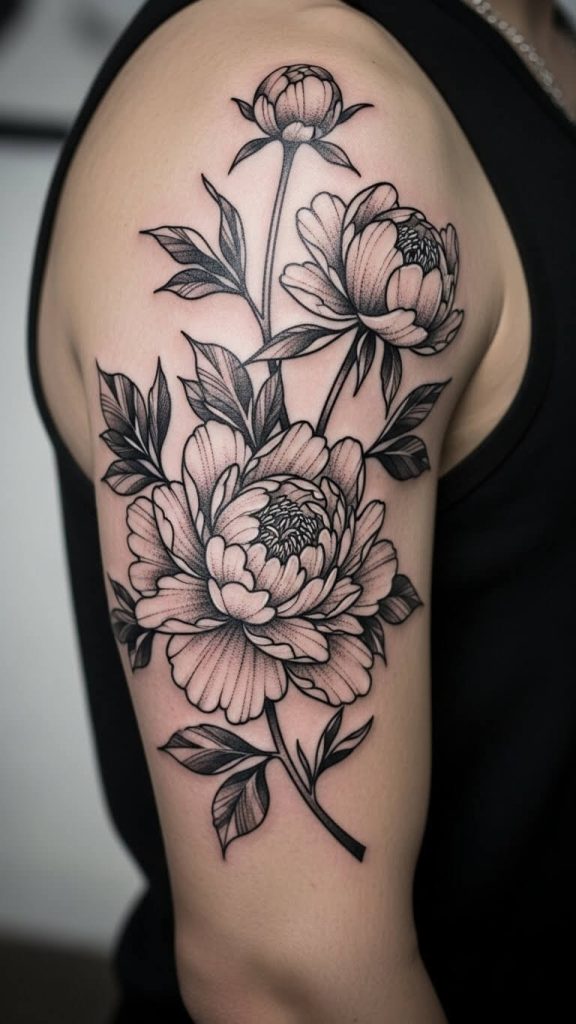 Color isn’t always necessary. A peony tattoo black and white design relies on contrast, shading, and structure.