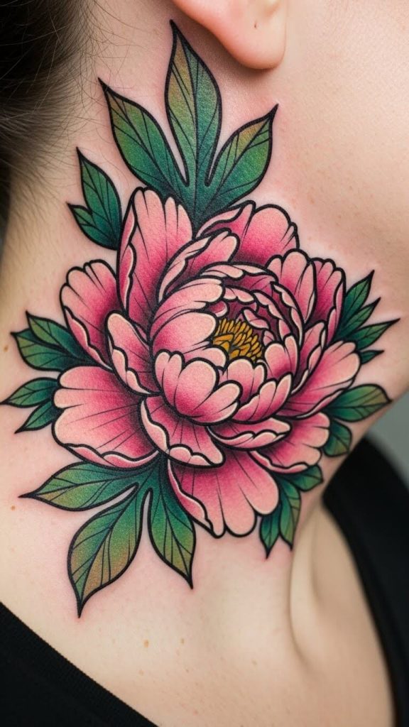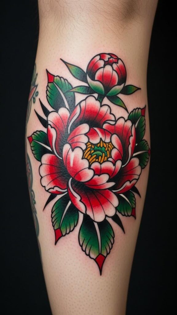 A peony tattoo traditional design features bold outlines, saturated colors, and old-school tattoo aesthetics.