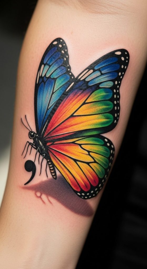 I absolutely adore the semicolon tattoo butterfly. It combines transformation (butterfly meaning) with resilience.
