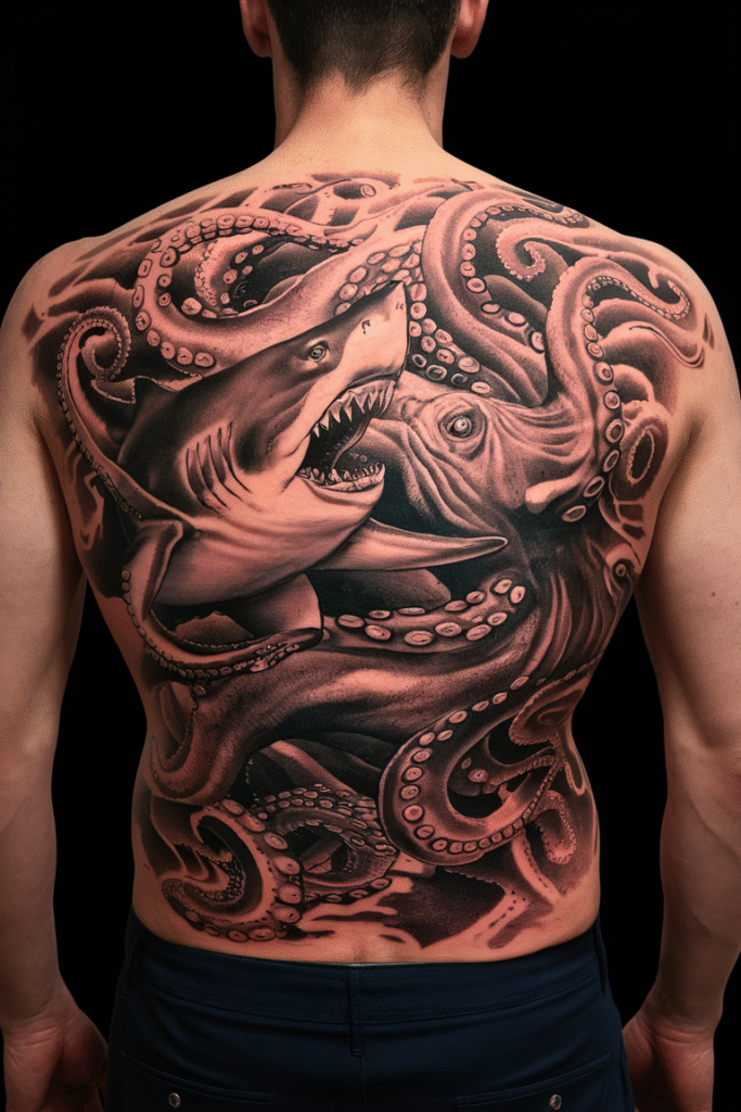 Wanna go epic? A shark battling a giant octopus makes for an intense, mythical scene. This is a story-on-your-body level piece.