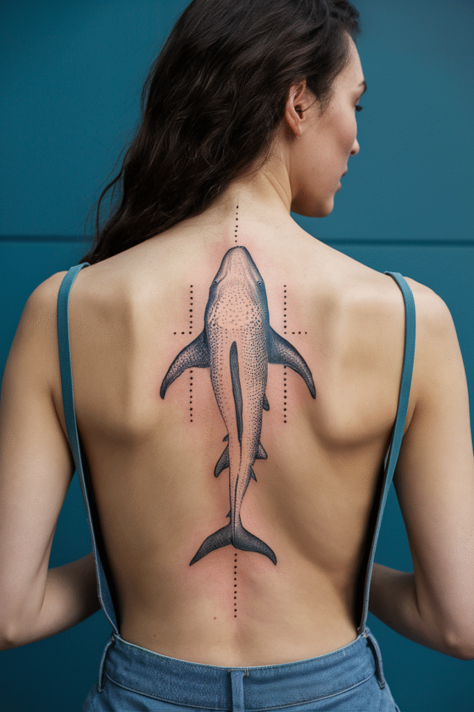 Let’s chill for a second. Not all sharks are about teeth and terror. The whale shark tattoo meaning leans toward peace, grace, and wisdom.