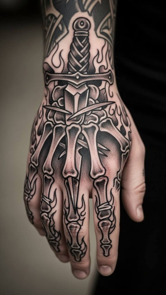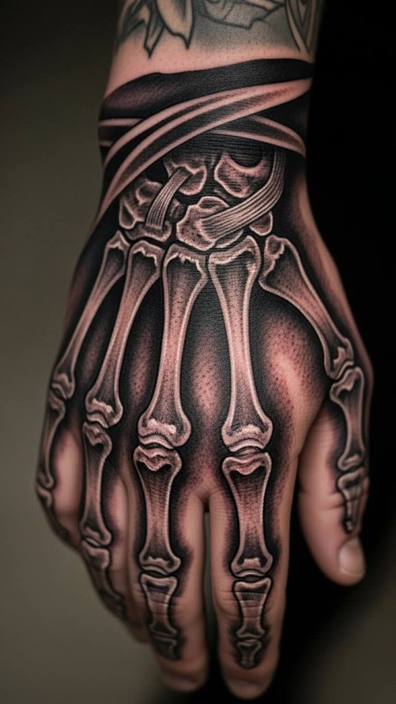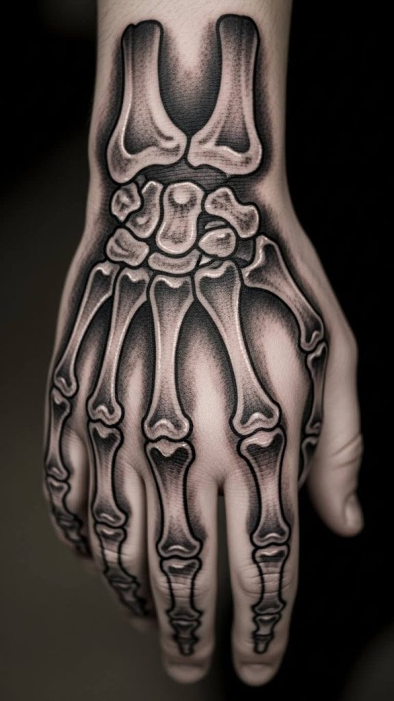 On the opposite end of the spectrum, you have hyper-realistic skeleton hand tattoos. These designs mimic actual bone anatomy and use heavy shading for a 3-D effect.