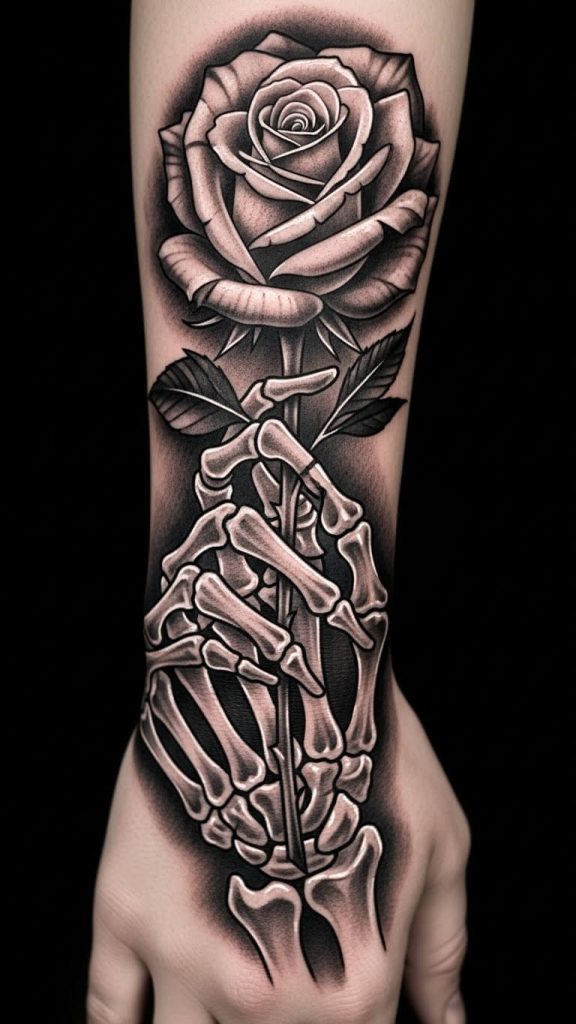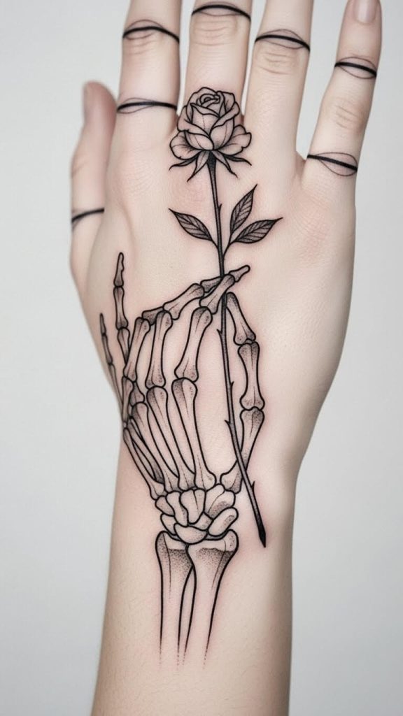 One of the most meaningful and beautiful variations is the skeleton hand tattoo with rose. The combination of life (rose) and death (bones) creates a powerful visual contrast.