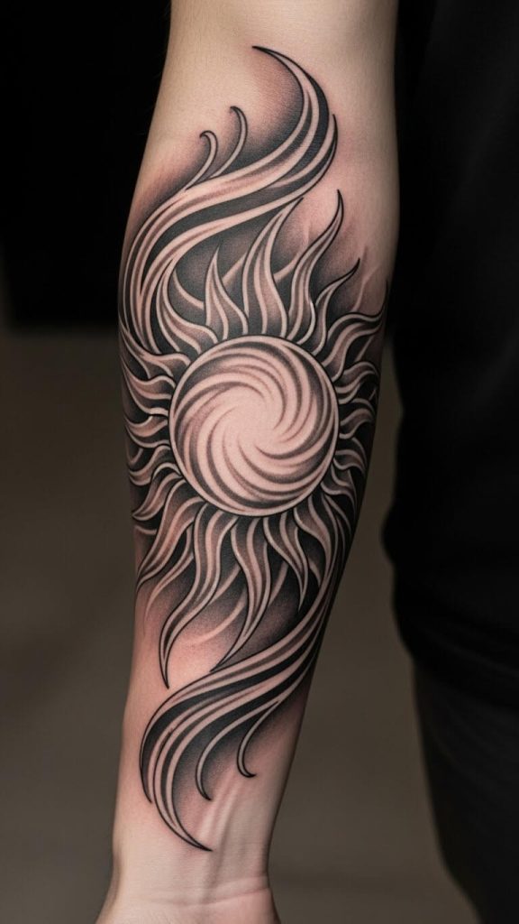 2. Sun Tattoo Arm Designs That Flow Naturally