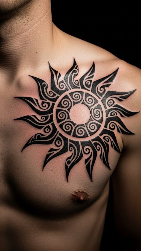 A sun tattoo men often choose tends to focus on strength, dominance, and resilience. Tribal suns and geometric styles are especially popular.