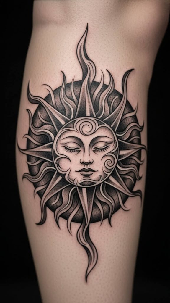 A sun tattoo on leg gives you room to experiment without constant exposure. Calves, thighs, and ankles all work beautifully.