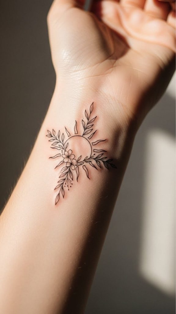 Sun tattoos for females often lean into elegance, balance, and personal growth. Think fine lines, florals, or paired celestial elements.