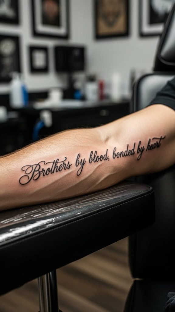 Words hit hard when they’re the right ones. A script tattoo is ideal if you and your brother share a phrase, saying, or inside joke.