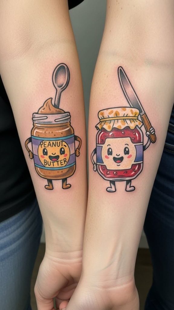 Love doesn’t always have to be deep and poetic. Funny couple tattoos are perfect if your relationship thrives on humor and sarcasm. Think: