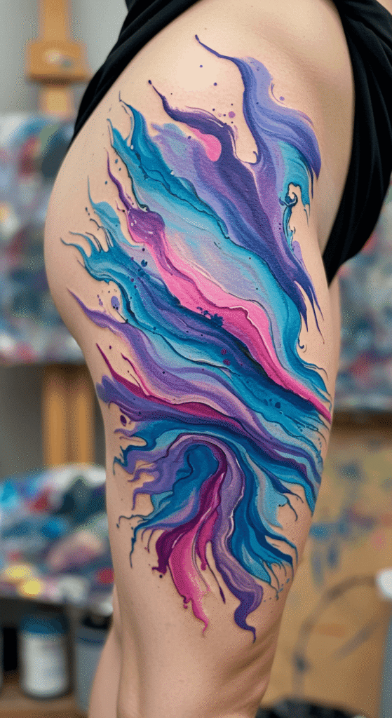 Abstract designs let your imagination run wild. Swirls of color for side thigh tattoos for females or bold strokes for guys.