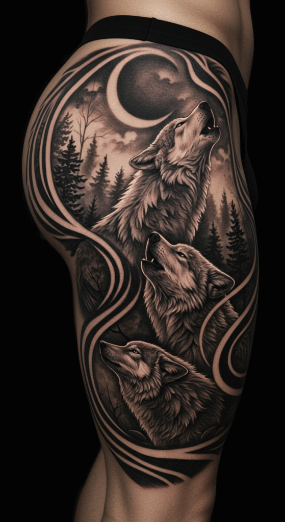 Why animals? They connect to your spirit. A small fox on the upper thigh keeps it cute, while a wolf pack on the back thigh adds drama.