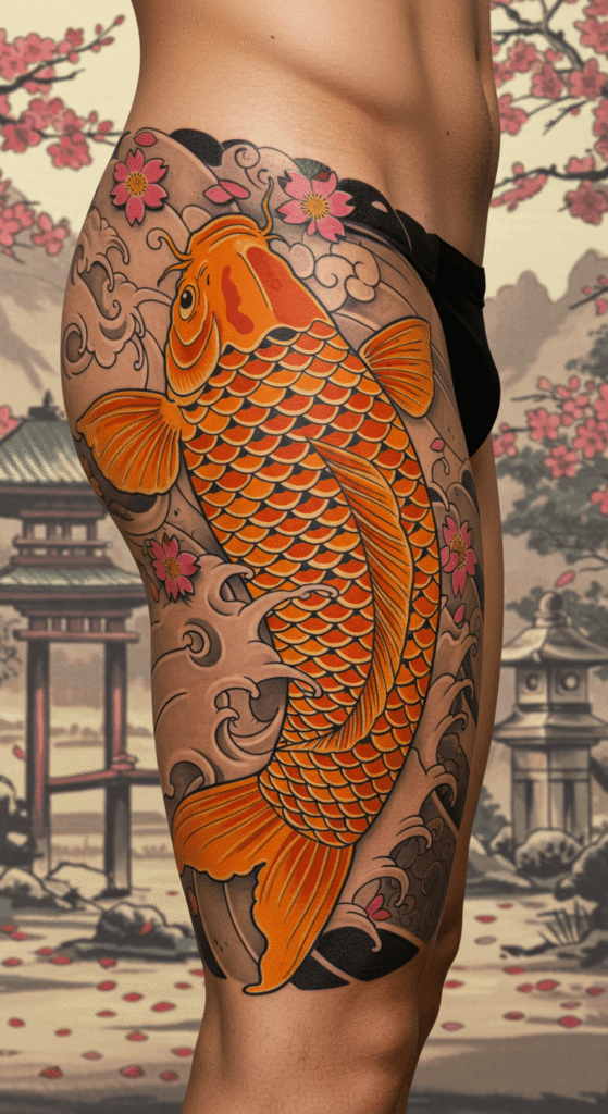 Incorporate symbols like Celtic knots or Japanese koi. Great for upper thigh tattoo male with cultural ties.
