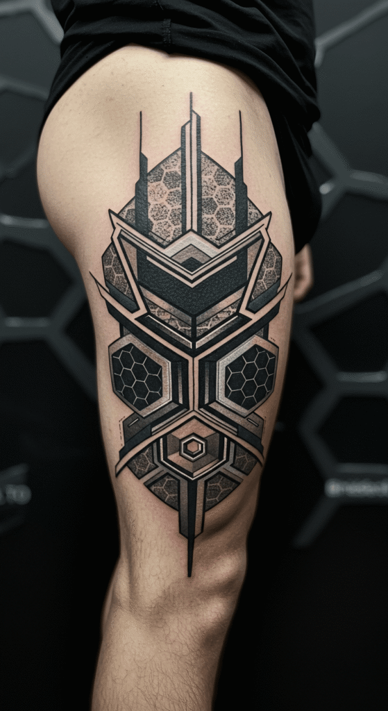Ready for something edgy? Geometric tattoos bring that clean, modern edge to your thigh. Guys often rock these as thigh tattoos male, with lines and shapes creating optical illusions that scream sophistication.