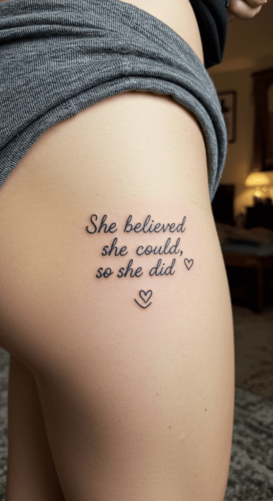 Words on skin? Absolutely! Thigh tattoos for females with meaning often feature inspiring quotes like “She believed she could, so she did.” It’s personal and empowering.