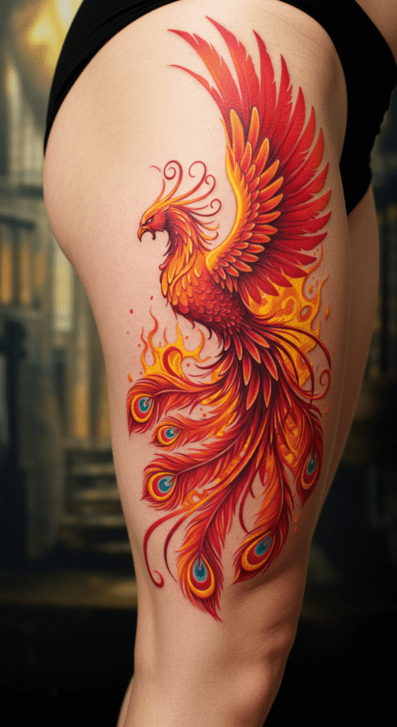 Dream big with dragons or phoenixes. These are epic for front thigh tattoos for females, rising from ashes to symbolize rebirth—super meaningful!