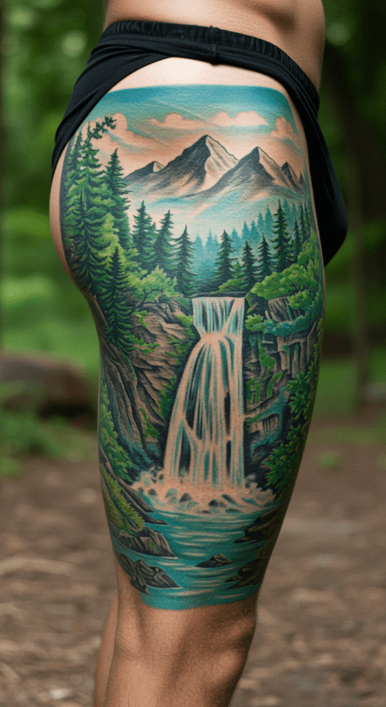 Bring the outdoors in with forests or mountains. Ideal for back thigh tattoo placements, these evoke peace and adventure.