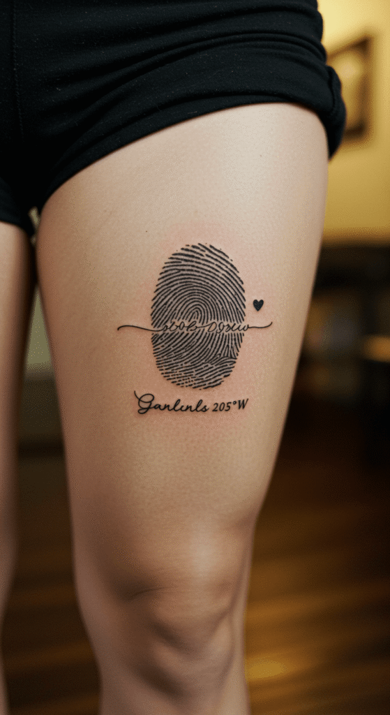Make it yours with dates, coordinates, or fingerprints. **Fingerprint tattoo](https://tattoolead.com/fingerprint-tattoo/) on the thigh? Heartfelt.