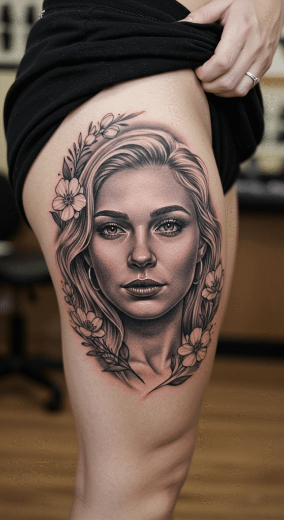 Keep it realistic or stylized. Thigh tattoo women often choose softer portraits, while men go detailed.