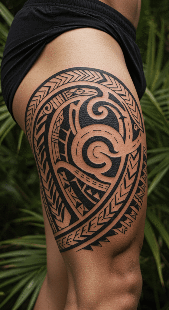 Go bold with tribal patterns. These are classics for thigh tattoos male, drawing from Polynesian or Maori influences for that warrior feel.