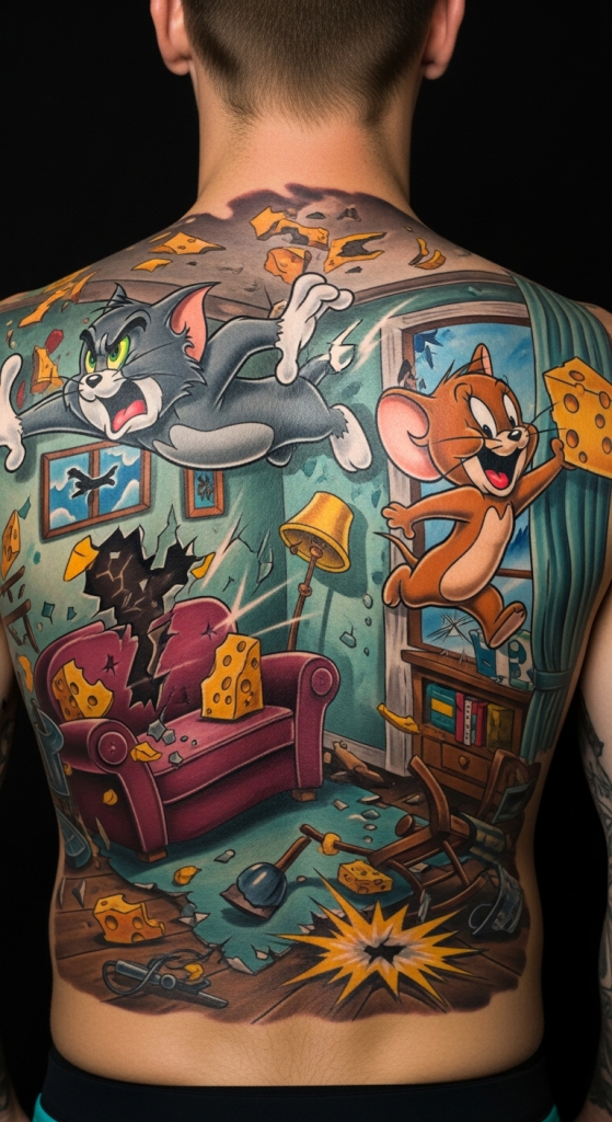 A tom and jerry tattoo back design gives your artist a huge canvas. This is where you go all-in with color, action scenes, and dramatic expressions.