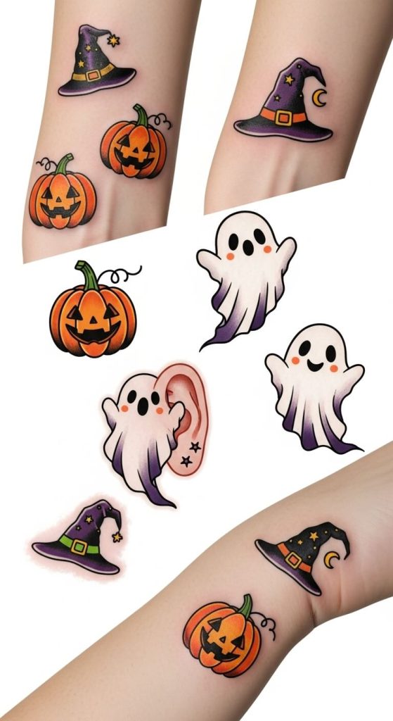 Yes! Tiny pumpkins, ghosts, and witch hats look amazing on smaller areas like wrists, ankles, or behind the ear. (Small Halloween tattoos for females)