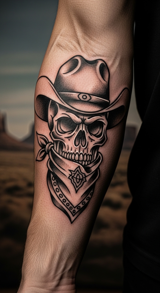 If there’s one design that screams western tattoos, it’s the cowboy skull. It blends two powerful themes: the rugged cowboy lifestyle and mortality.