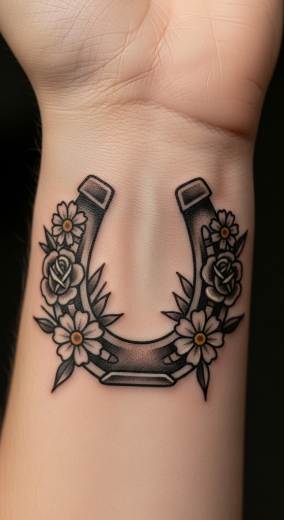 FYI, many people combine horseshoes with floral designs like flower tattoo elements to soften the look while keeping it traditional.
