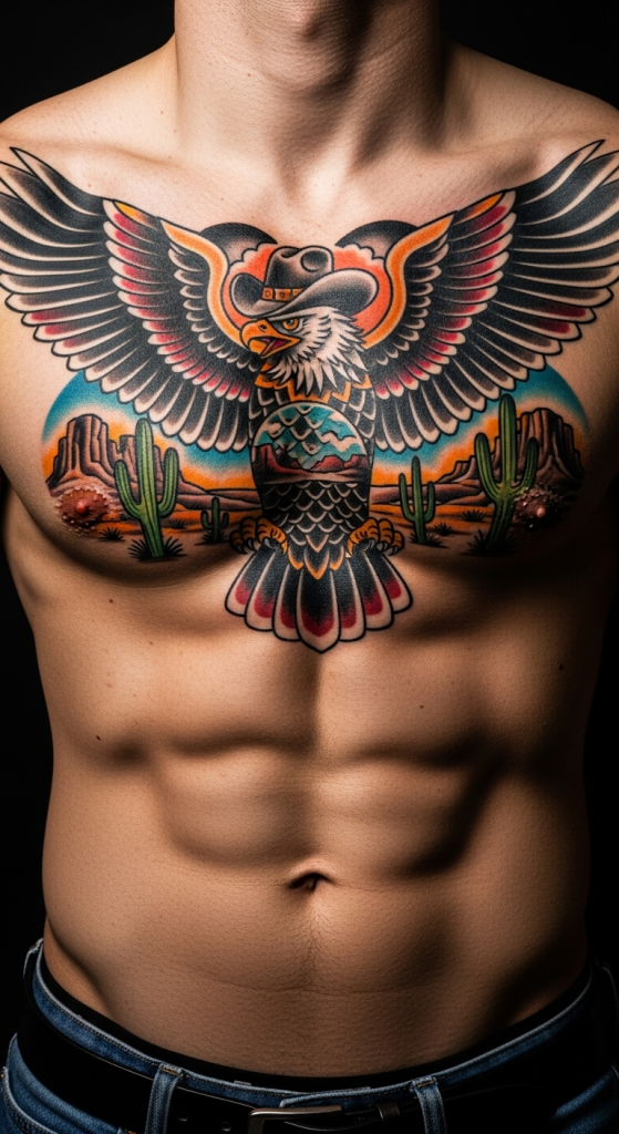The eagle is already a staple in traditional tattooing, but when you add western elements like cowboy hats or desert landscapes it becomes something unique.